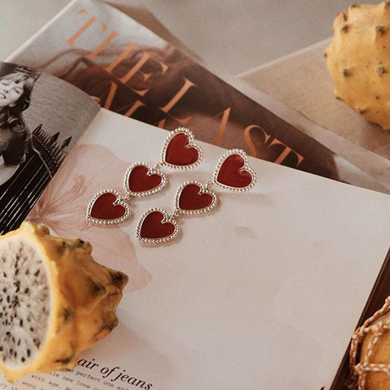 Estos pendientes largos con tres corazones esmaltados colgantes están disponibles en negro profundo o rojo intenso, ambos enmarcados por un delicado borde dorado. Su diseño vertical estiliza el rostro y aporta un toque chic a cualquier look.