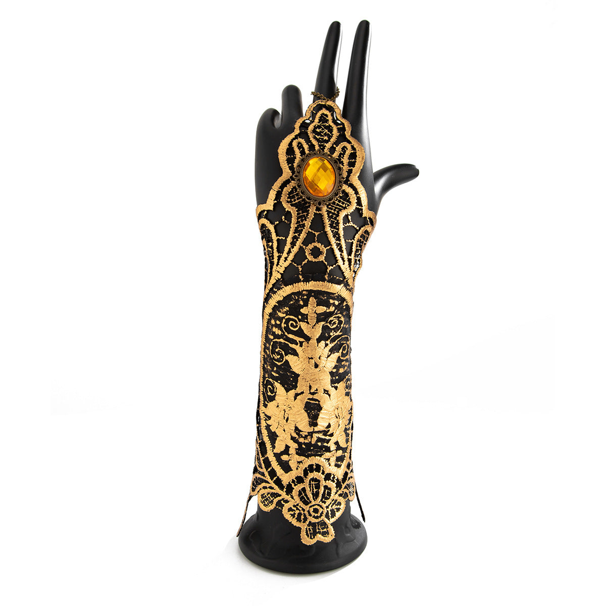 Transforma cualquier look en una obra de arte con este impresionante set de collar y guante tipo joya, elaborado en encaje negro y bordado dorado, con una piedra central en tono ámbar. El collar cubre el escote como una pechera, mientras que el guante llega hasta el antebrazo con elegancia y teatralidad.