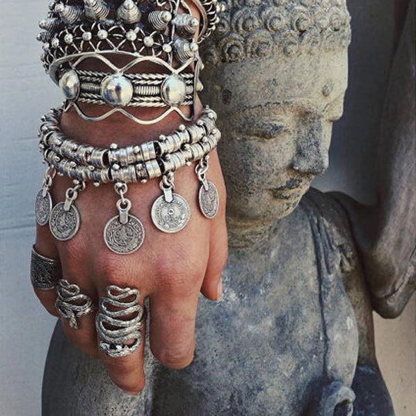Una joya que evoca viajes, libertad y carácter. Esta tobillera estilo bohemio está decorada con monedas colgantes vintage y detalles en plata envejecida, ideal para resaltar tu look de verano o complementar un estilo étnico y atrevido. Su diseño versátil permite llevarla también como pulsera ancha en la muñeca.
